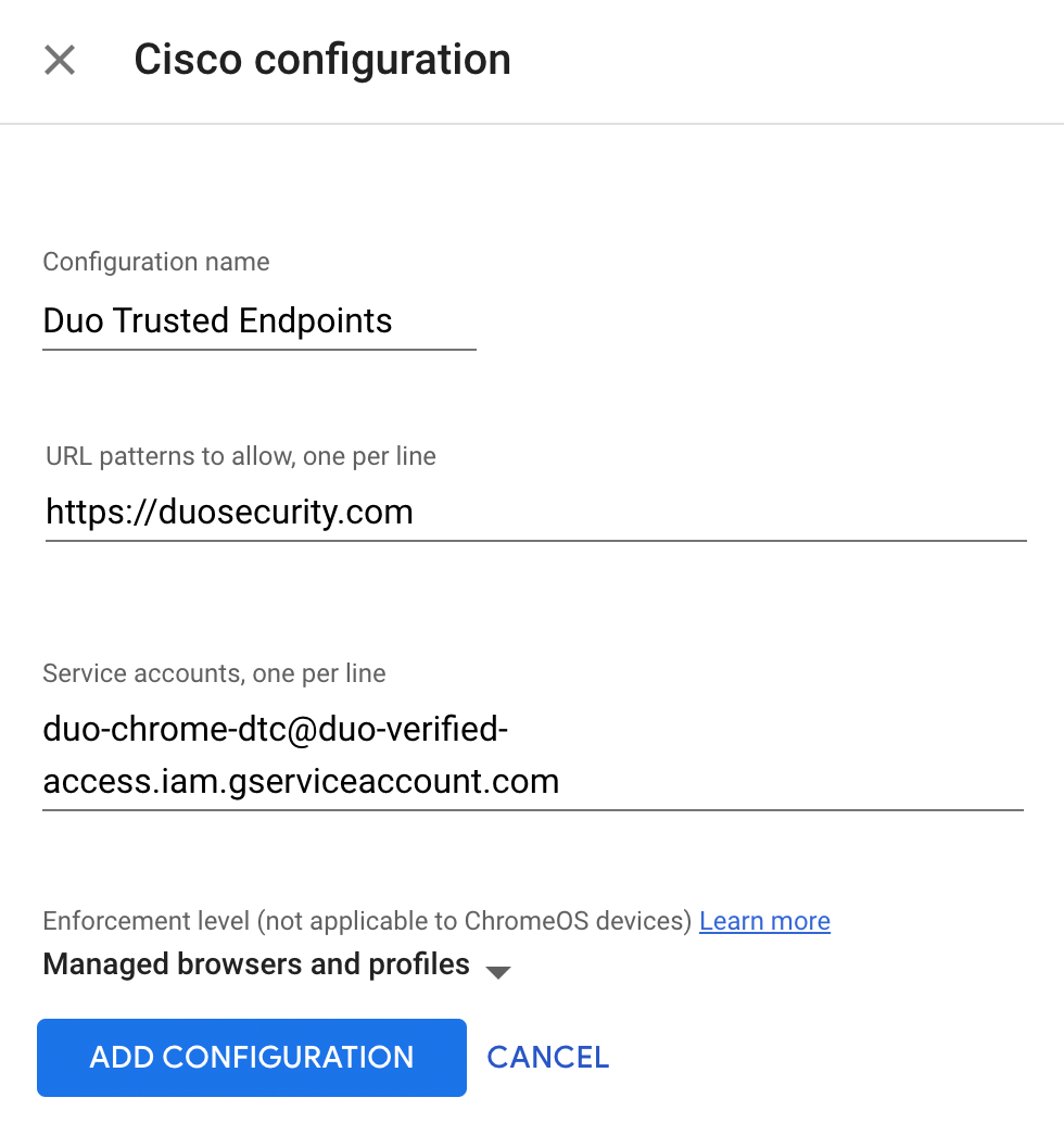 Give your new Cisco configuration any meaningful and unique Configuration name you wish. If you will be creating Chrome Enterprise Device Trust Connector integrations for multiple operating systems you might want to include the OS name here.